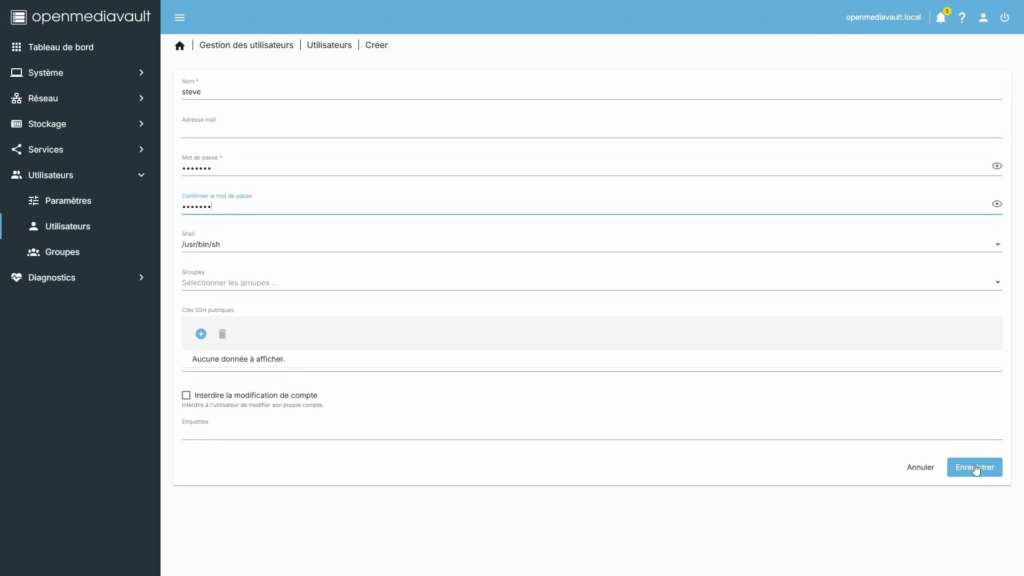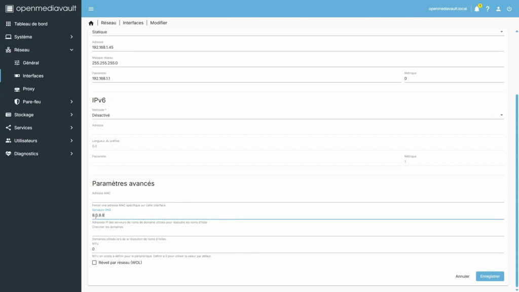 Sauvegardez, appliquez, puis reconnectez-vous à OpenMediaVault via la nouvelle IP.