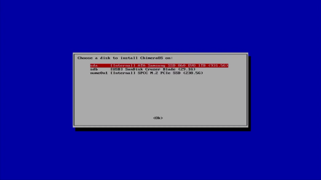 L’installateur vous demande de choisir sur quel disque installer ChimeraOS.