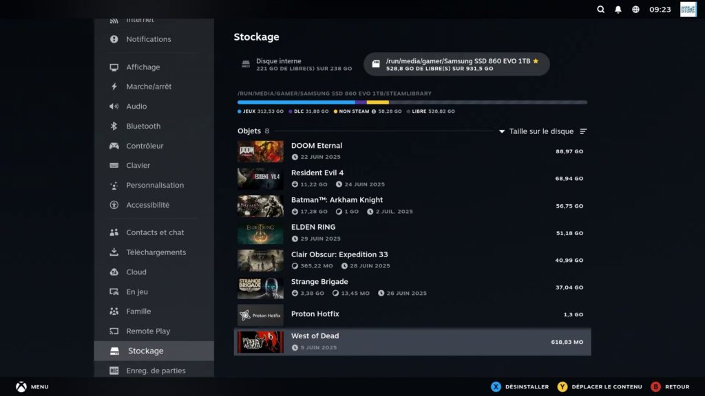 Le montage d’un disque, en langage Linux, c’est le fait de “brancher” ce disque dans l’arborescence du système, un peu comme brancher une clé USB et la voir apparaître dans “Ce PC” sous Windows. ChimeraOS détecte vos disques supplémentaires dans la section stockage et peut les rendre accessibles à Steam.